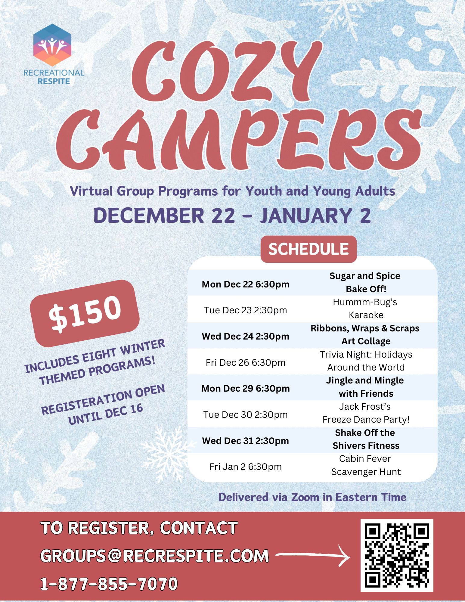 This Winter Break, we are bringing back Cozy Campers! We’re offering a bundle of eight virtual programs to help you stay connected and shake off your shivers throughout the Winter Break. Open to youth (12+) and young adults (16+) of all abilities throughout Canada.